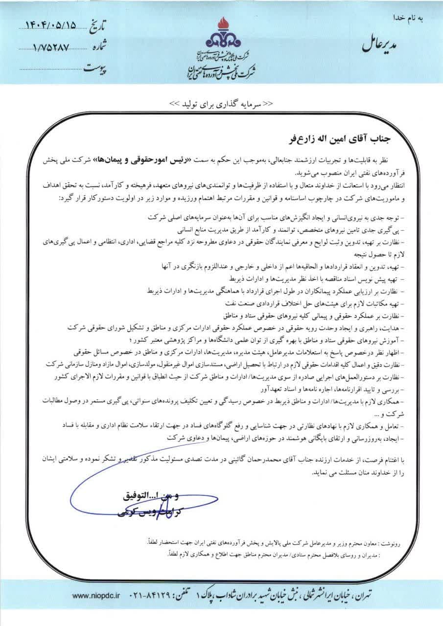 انتصاب امیناله زارعفر به عنوان رئیس امو حقوقی و پیمانهای شرکت ملی پخش