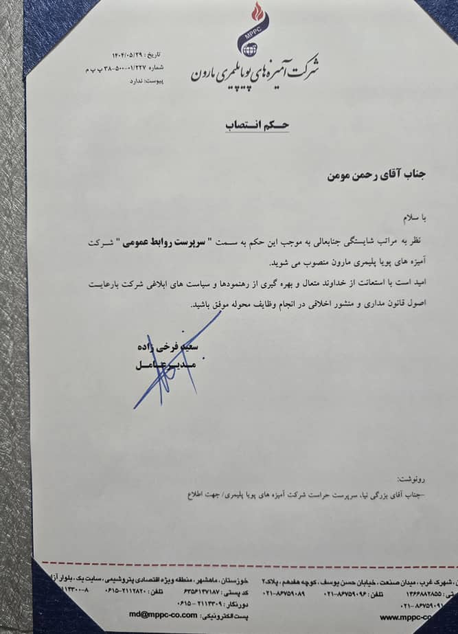 رحمن مومن، به سمت سرپرست روابط عمومی شرکت آمیزههای پویا پلیمری مارون منصوب شد
