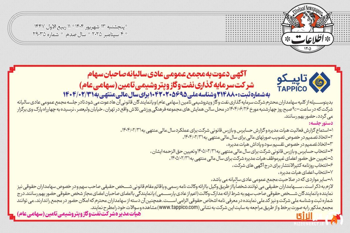بدینوسیله از کلیه سهامداران محترم شرکت سرمایه گذاری نفت و گاز و پتروشیمی تأمین (سهامی عام) و یا نمایندگان قانونی آنها دعوت میشود تا در جلسه مجمع عمومی عادی سالیانه شرکت که در ساعت ۹ صبح روز چهارشنبه مورخ ۱۴۰۴/۰۶/۲۶ در محل سالن همایشهای مجموعه فرهنگی ورزشی تلاش واقع در تهران، خیابان ولیعصر (عج)، نرسیده به چهارراه پارک وی برگزار میگردد حضور بهم رسانند.