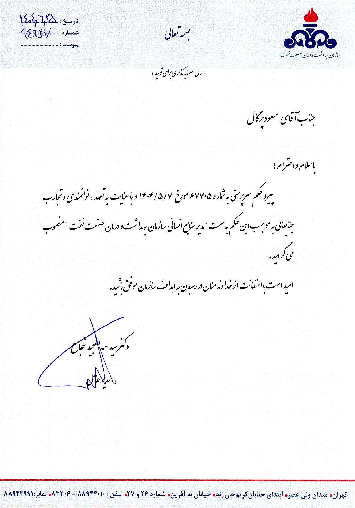 در حکم انتصاب مسعود پرگال بعنوان مدیر منابع انسانی سازمان بهداشت و درمان صنعت نفت آمده است: