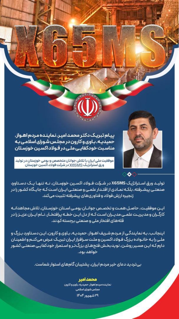اینجانب، به نمایندگی از مردم شریف اهواز، حمیدیه، باوی و کارون، این دستاورد بزرگ و ملی را به خانواده بزرگ فولاد اکسین و ملت سرافراز ایران تبریک عرض میکنم و اطمینان دارم که این مسیر روشن، نویدبخش فتحهای بزرگتر و استمرار خودکفایی صنعتی کشور خواهد بود.