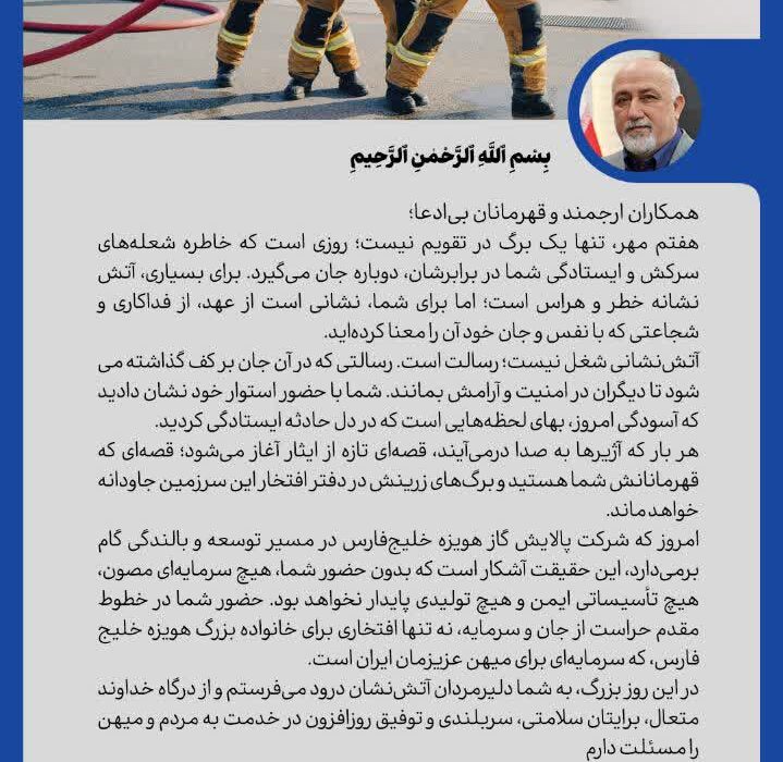 پیام مدیرعامل شرکت پالایش گاز هویزه خلیج‌فارس به مناسبت روز آتش‌نشانی