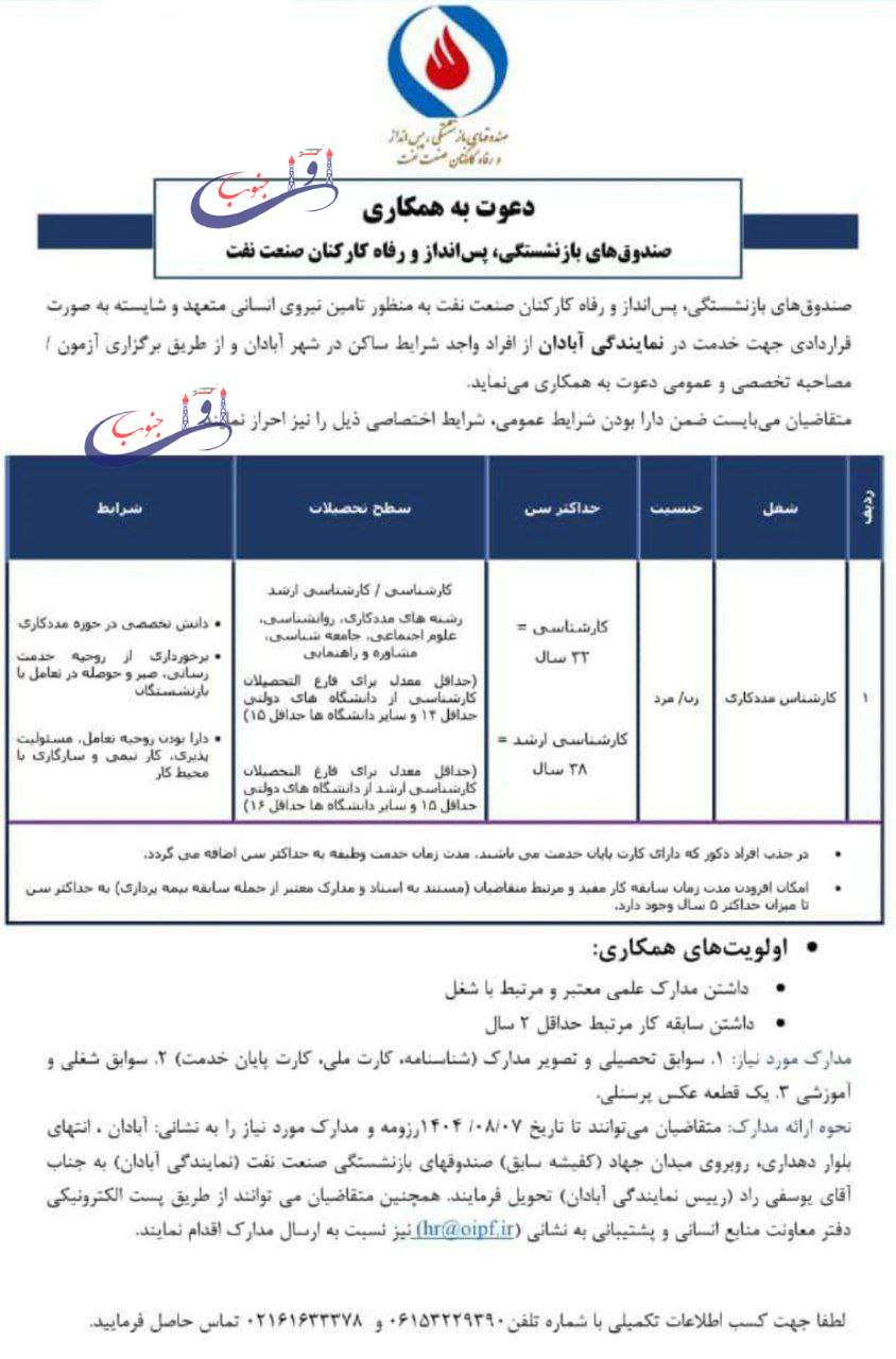 متقاضیان استخدام صندوقهای بازنشستگی صنعت نفت می توانند تا تاریخ ۱۴۰۴/۰۸/۰۷ رزومه و مدارک مورد نیاز را به نشانی آبادان انتهای بلوار دهداری روبروی میدان جهاد صندوقهای بازنشستگی صنعت نفت نمایندگی آبادان به جناب آقای یوسفی راد رییس نمایندگی آبادان تحویل نمایند.