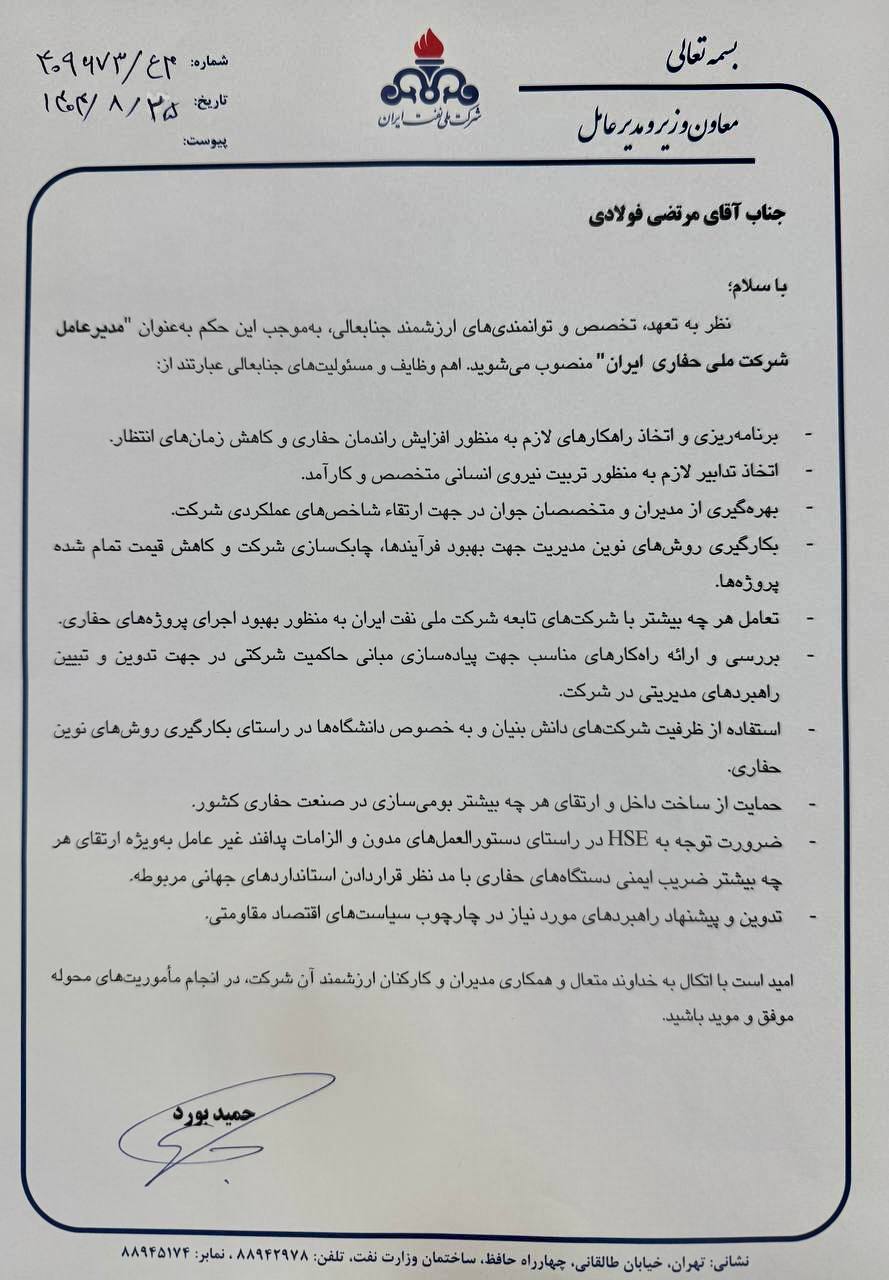 به گزارش خبرصنعتی؛ طی حکمی از طرف حمید بورد مدیرعامل شرکت ملی نفت ایران، مرتضی فولادی به عنوان مدیرعامل شرکت ملی حفاری ایران منصوب شد.