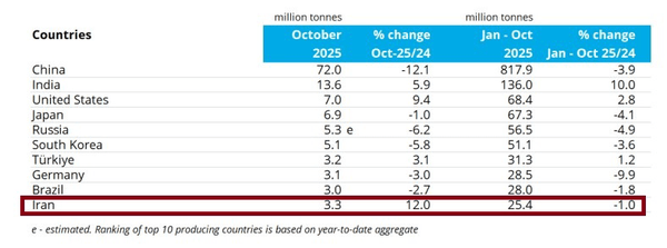 میزان تولید فولاد ایران در ۱۰ ماه نخست ۲۰۲۵ به طور متوسط ۲۵.۴ میلیون تن بوده که ۱ درصد کمتر از مدت مشابه سال پیش از آن است.