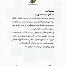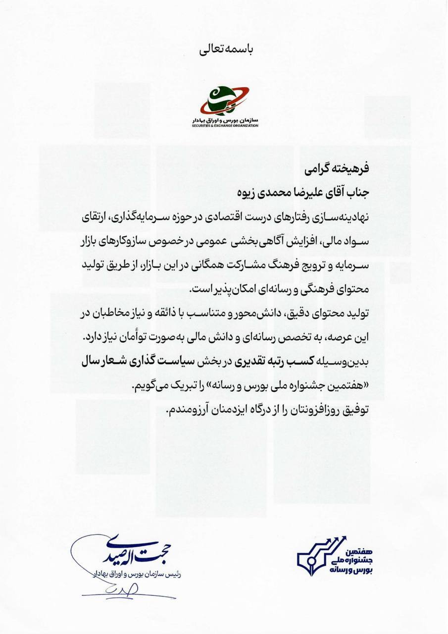 این مقاله که در بخش تبیین سیاستگذاری شعار سال نگارش شده؛ از سوی هیات داوران هفتمین جشنواره بورس و رسانه مورد تقدیر قرار گرفته و نگارنده از رئیس سازمان بورس و اوراق بهادار لوح تقدیر دریافت نمود.