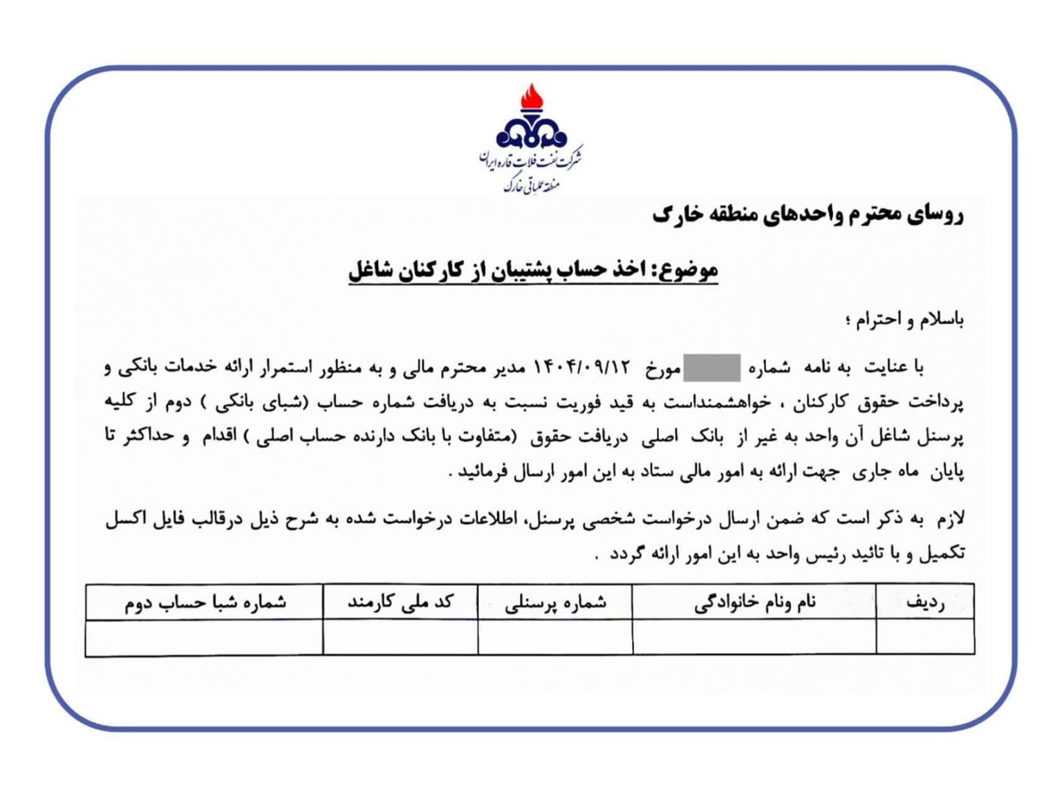 به گزارش خبر صنعتی؛ عطف به مکاتبه مدیر محترم مالی شرکت نفت فلات قاره منطقه خارگ و به منظور استمرار ارائه خدمات بانکی و پرداخت حقوق کارکنان شرکت نفت فلات قاره ، خواهشمند است به قید فوریت نسبت به دریافت شماره (حساب شبای بانکی دوم از کلیه پرسنل شاغل آن واحد به غیر از بانک اصلی دریافت حقوق، متفاوت با بانک دارنده حساب اصلی) اقدام و حداکثر تا پایان ماه جاری جهت ارائه به امور مالی ستاد به این امور ارسال فرمائید.