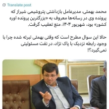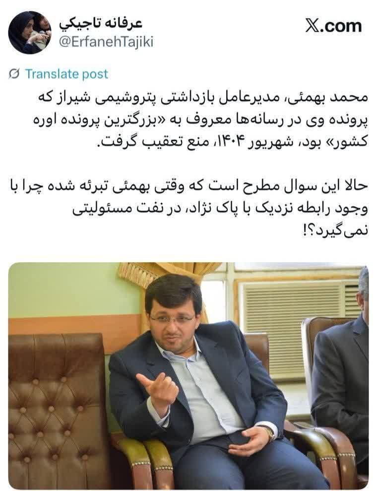 حالا این سوال مطرح است که وقتی بهمئی تبرئه شده چرا با وجود رابطه نزدیک با پاک نژاد، در نفت مسئولیتی نمیگیرد؟”