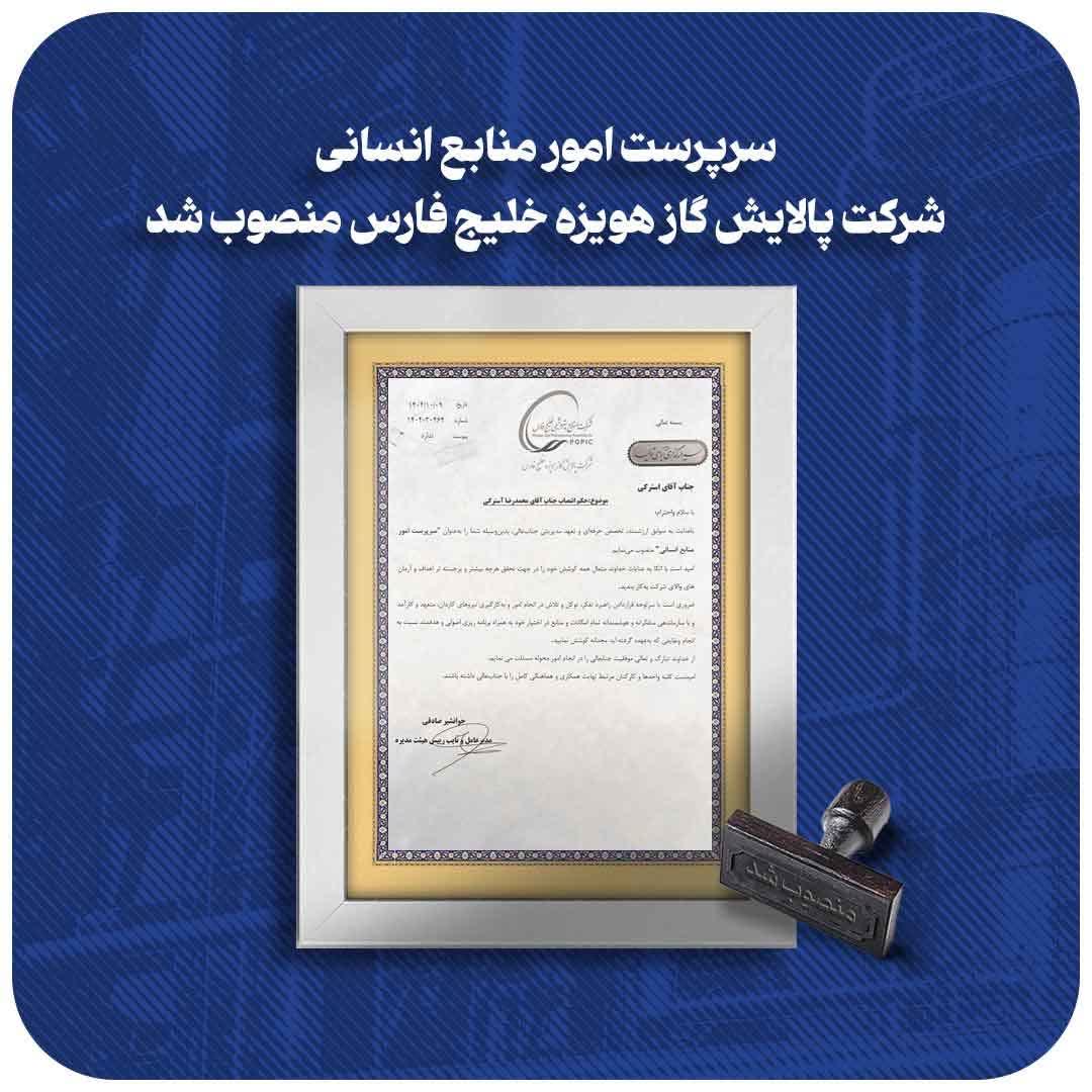 انتصاب سرپرست امور منابع انسانی شرکت پالایش گاز هویزه خلیج فارس