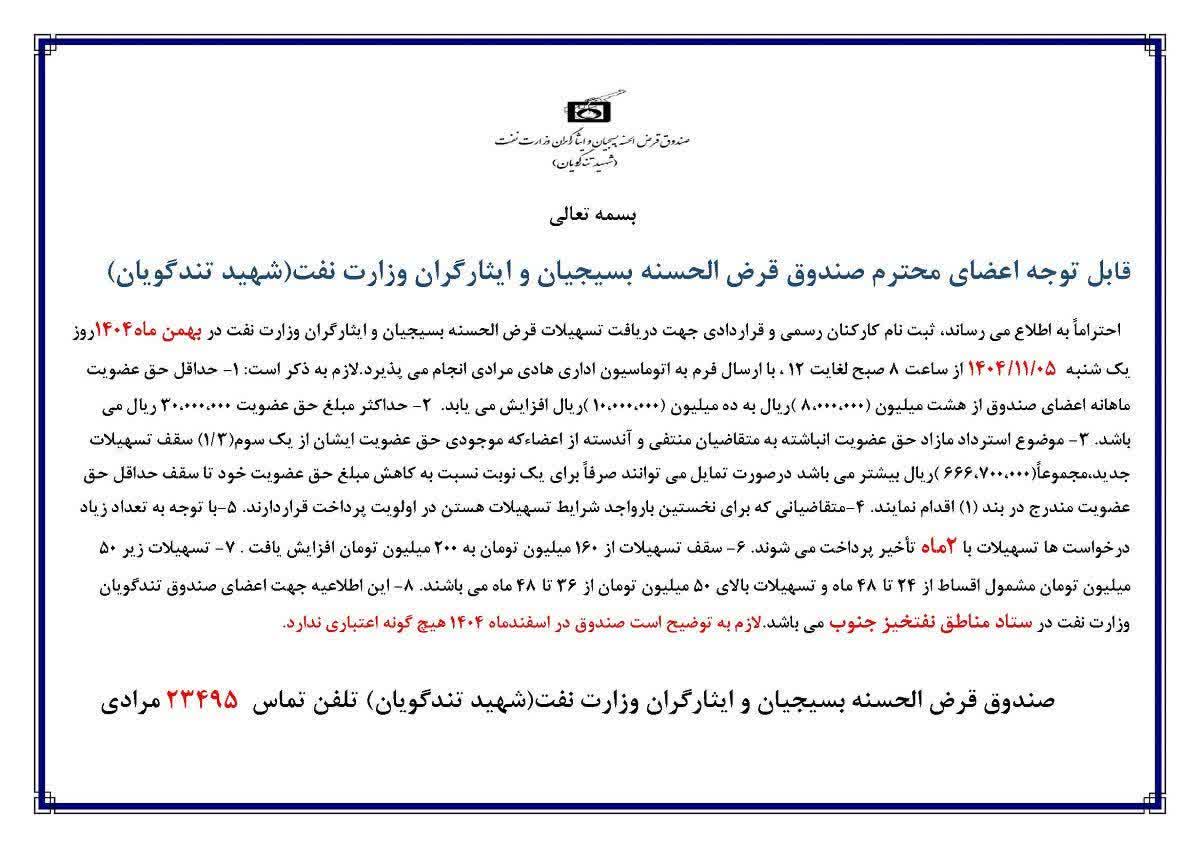 اطلاعیه صندوق قرضالحسنه بسیجیان و ایثارگران وزارت نفت