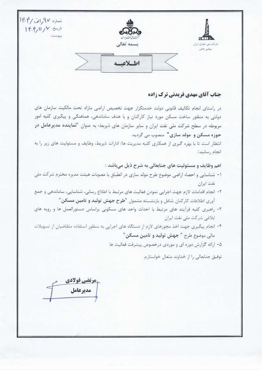 نماینده مدیرعامل ملی حفاریی در حوزه مسکن و مولدسازی منصوب شد