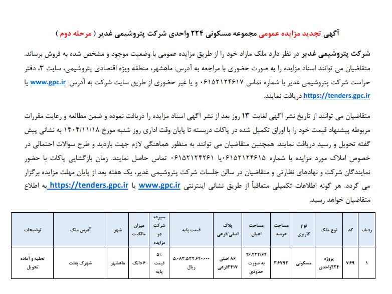آگهی تجدید مزایده عمومی مجموع مسکونی ۲۲۴ واحدی شرکت پتروشیمی غدیر (مرحله دوم)